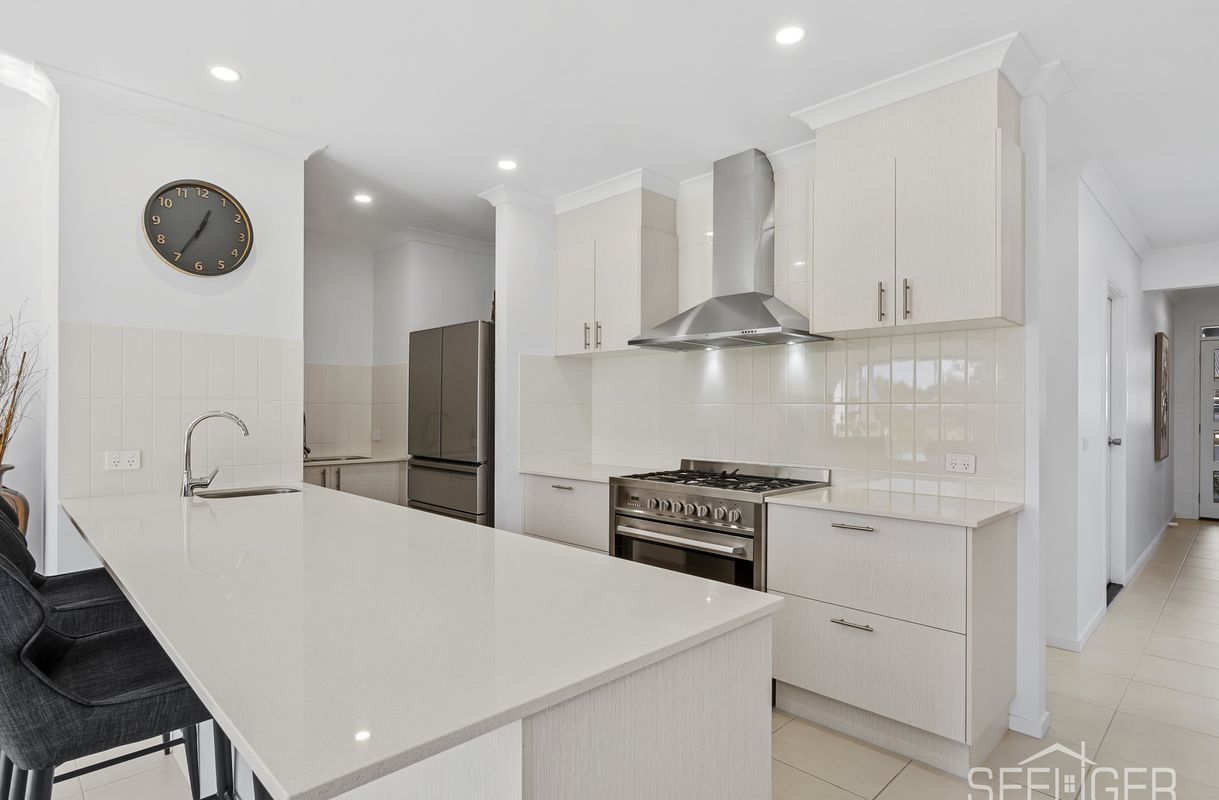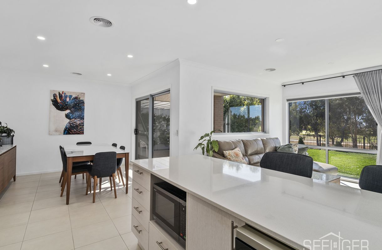The main living area is open, bright and welcoming, with the kitchen, dining and lounge all flowing together. The kitchen has stone benchtops, modern appliances, and a walk-in pantry – everything you need for family dinners or entertaining friends. Sliding doors lead out to a covered alfresco area where you can sit back, relax, and enjoy the peaceful golf course views.